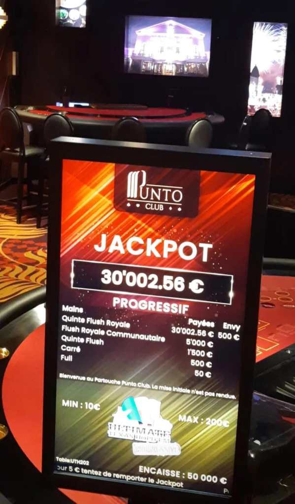 Le club est ouvert de 21 heures à 5 heures du matin et dispose de 8 tables de jeux. Trois sont dédiées au Punto Banco avec des mises minimales à 20€ ou 40€. Deux tables sont consacrées à l’Ultimate Poker avec des mises minimales fixées à 10€ et un Jackpot progressif qui dépasse les 30.000€ en ce moment.