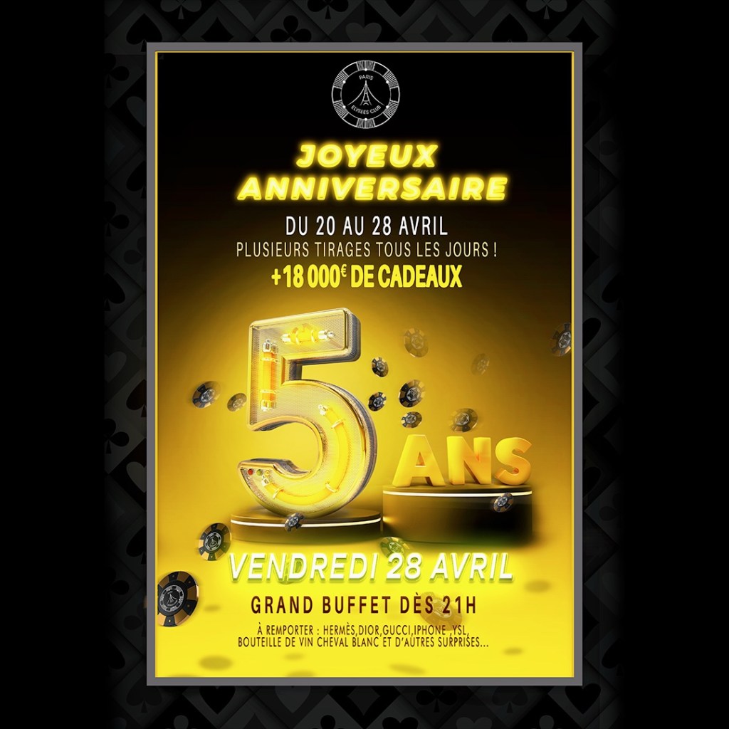 Le Paris Elysées Club va fêter son 5e anniversaire. Pour faire plaisir à ses joueurs, du 20 au 28 avril, le club de jeux du groupe Tranchant organise une grande loterie avec des lots à gagner quotidiennement pour un montant total de 18.000€. La soirée du vendredi 28 avril constituera le point d’orgue de cette opération avec la mise en jeu de lots exceptionnels.