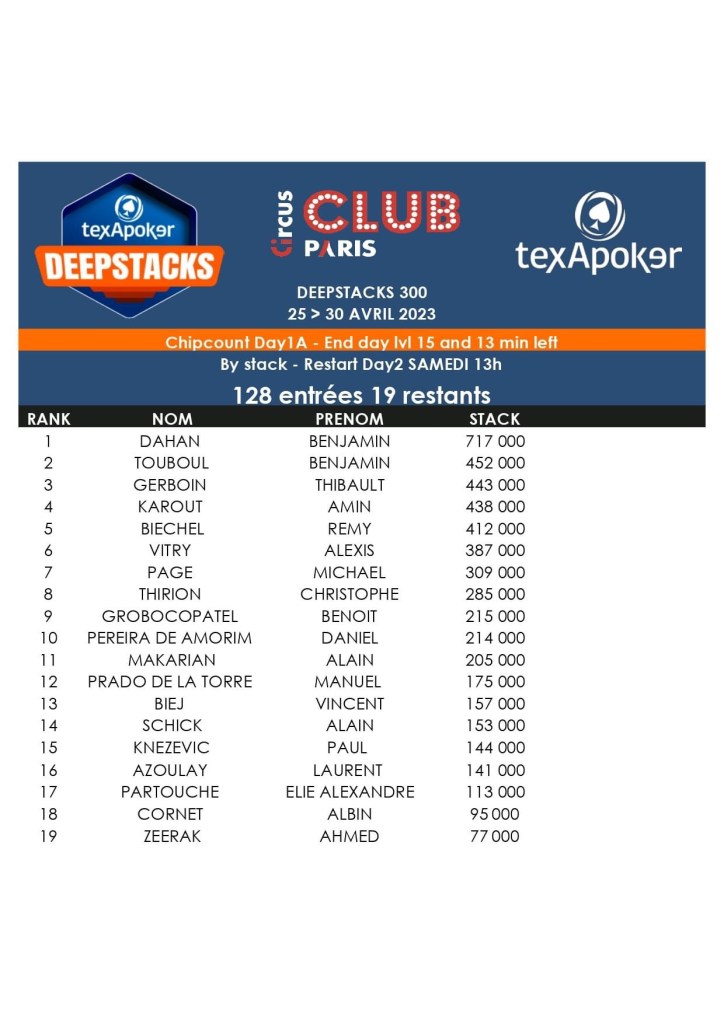 128 entrants ont été comptabilisés sur le Day 1A. C’est Benjamin Dahan qui a monté le plus de jetons à l’issue de cette journée (717.000), il est suivi par Benjamin Touboul et Thibaut Gerboin. Ça passe aussi pour Rémy Biechel et Benoit Grobocopatel. 19 joueurs se sont qualifiés pour le Day 2.