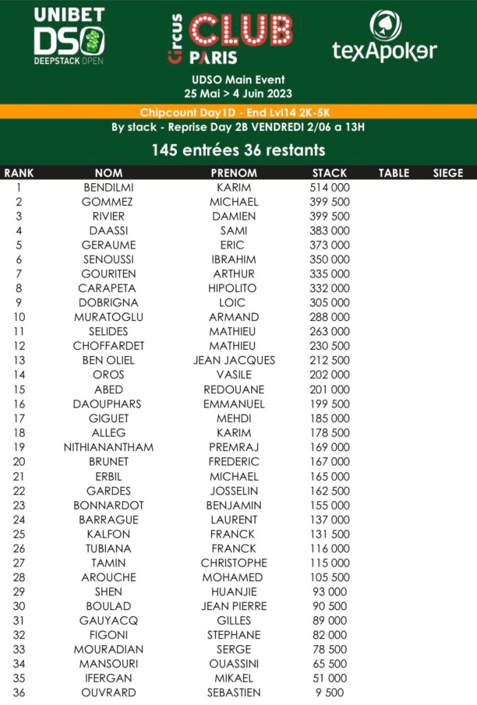 Au Club Circus, le Main Event de l’UDSO en partenariat avec TexaPoker se poursuit avec le Day 1D qui a eu lieu hier. 145 entrants ont été comptabilisés sur ce tournoi à 550€. 36 joueurs sont parvenus à se qualifier pour le Day 2B. C’est Karim Bendilmi qui mène les troupes avec 514.000 jetons, suivis de Michael Gommez (399.500) et Damien Rivier (399.500).