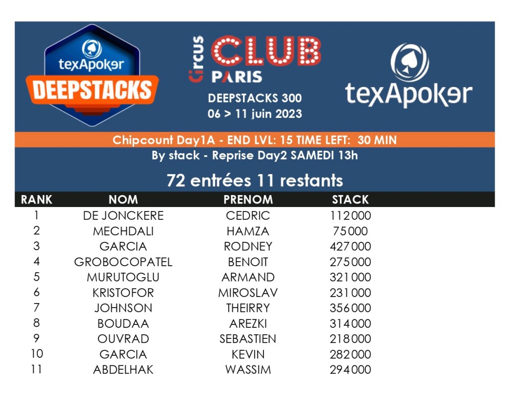 72 entrants ont été comptabilisés sur le Day 1A. C’est Rodney Garcia qui a monté le plus de jetons à l’issue de cette journée (427.000), il est suivi par Theirry Johnson et Armand Murutoglu. Ça passe aussi pour Benoit Grobocopatel (photo de Une). 11 joueurs se sont qualifiés pour le Day 2. Le programme complet du TexaPoker Deepstacks est disponible ici !