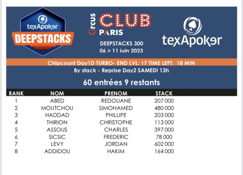 Le TexaPoker Deepstacks se poursuit au Club Circus, hier deux journées de départ étaient organisées sur ce tournoi à 300€ de Buy-in.
