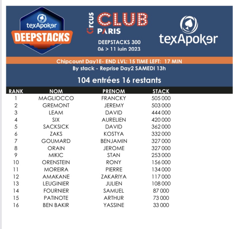Hier, au Club Circus, deux dernières journées de départ étaient proposées sur le TexaPoker Deepstacks. 104 joueurs étaient en lice sur le Day 1E pour 16 qualifiés. C’est Francky Magliocco qui a cumulé le plus de jetons.