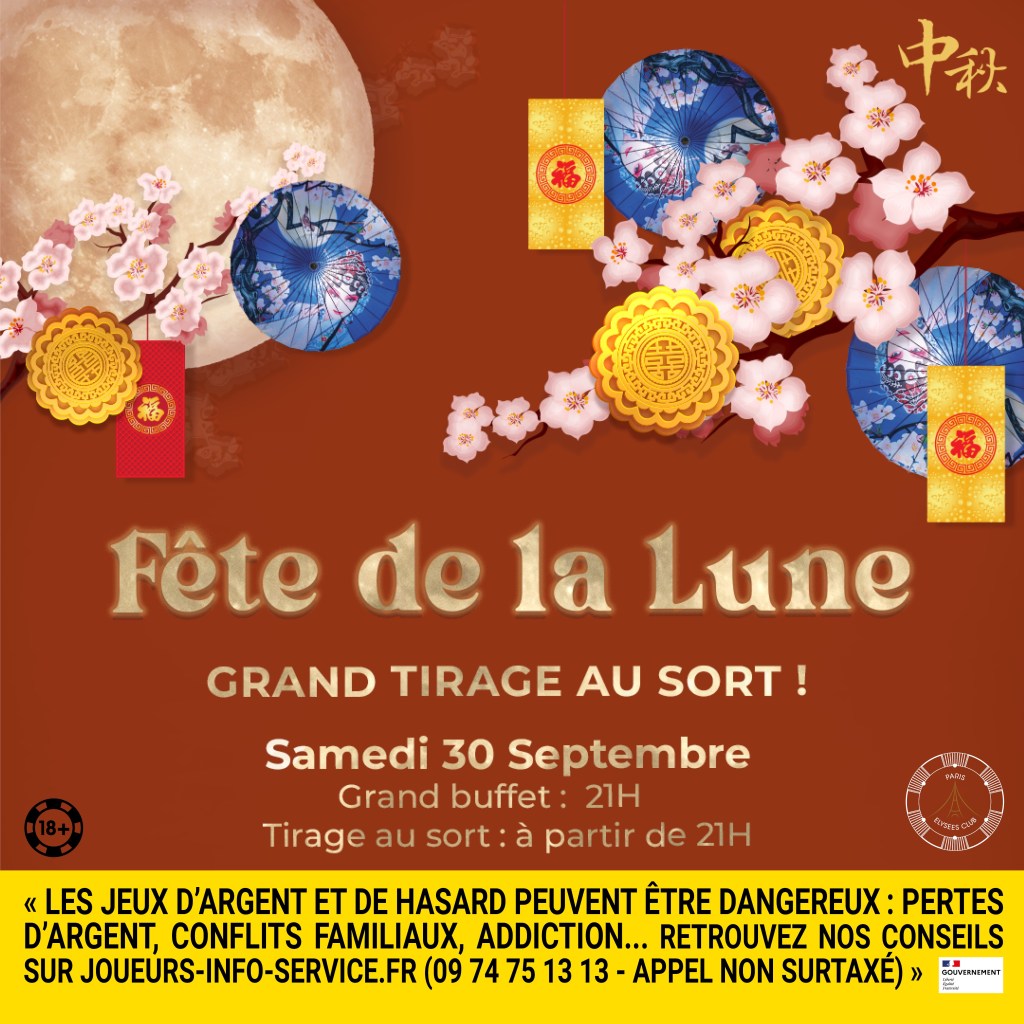 Le samedi 30 septembre, à partir de 21h, le Paris Elysées Club fera gagner de nombreux lots à l’occasion d’une grande loterie pour célébrer la fête de la Lune. Des produits de luxe, des jetons promotionnels seront mis en jeu. Un grand buffet sera proposé aux joueurs et joueuses. Chaque année, le club de la rue Marbeuf fait le plein à l’occasion de cette fête.