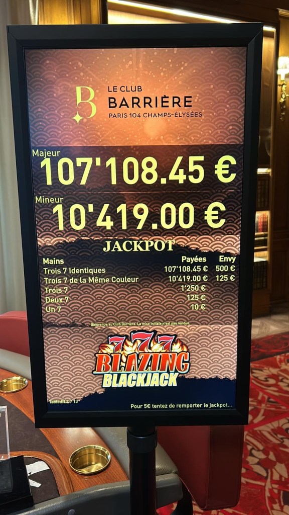 Place forte du jeu au cœur du triangle d’or, le Club Barriere propose une offre large pour les passionnés de jeux de contrepartie. Certaines tables sont dotées d’un Jackpot progressif. En ce moment les cagnottes sont très alléchantes.