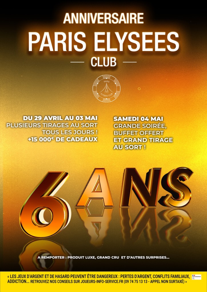 Le Paris Elysées Club va célèbrer son 6e anniversaire. Pour faire plaisir à ses joueurs et à ses joueuses, du 29 avril au 4 mai 2024, le club de jeux du groupe Tranchant organise une grande loterie avec des lots à gagner quotidiennement pour un montant total de 15.000€. La soirée du samedi 4 mai constituera le point d’orgue de cette opération avec la mise en jeu de lots exceptionnels.
