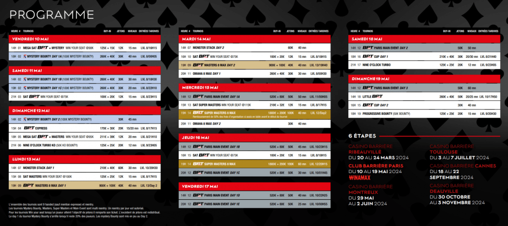 A noter que sur Winamax, des satellites pour le Main Event permettront de se qualifier à moindres frais. Jusqu’au 7 mai, un siège est garanti chaque mardi à 21h15, avec un format tantôt 10€ rebuy, tantôt 50 € freezeout avec un re-entry autorisé. Et plusieurs satellites sont aussi au programme en live directement au Club Barrière pendant le festival, pour le Main mais aussi le Masters.