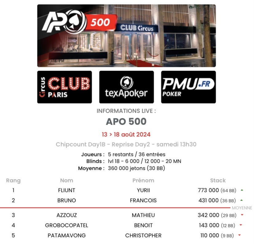 Au Club Circus, l’APO 500 organisé en partenariat avec TexaPoker continue de battre son plein. Après un Day 1A qui a enregistré 43 entrées, le Day 1B a vu 36 participants tenter leur chance pour décrocher une place au Day 2. À l’issue de cette seconde journée, seuls 5 joueurs ont réussi à se qualifier pour la reprise prévue samedi.