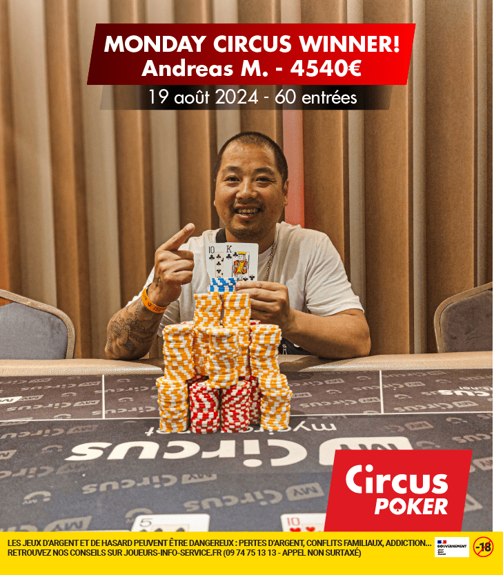 Lors du Monday Circus au Club Circus, Andreas Mai a décroché sa première victoire au club, remportant 4 540 €. Le tournoi a rassemblé 60 participants pour un buy-in de 300 €, générant un prizepool total de 14 976 €.