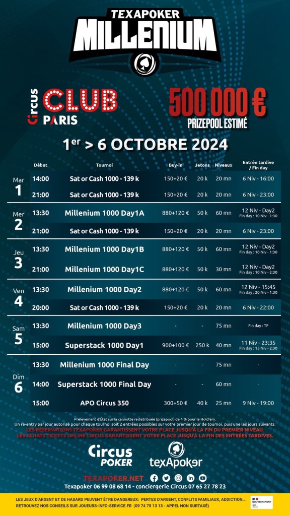 Texapoker revient en force au Club Circus à Paris avec son festival incontournable, le Texapoker Millenium, mettant en avant un Main Event à 1000 €.