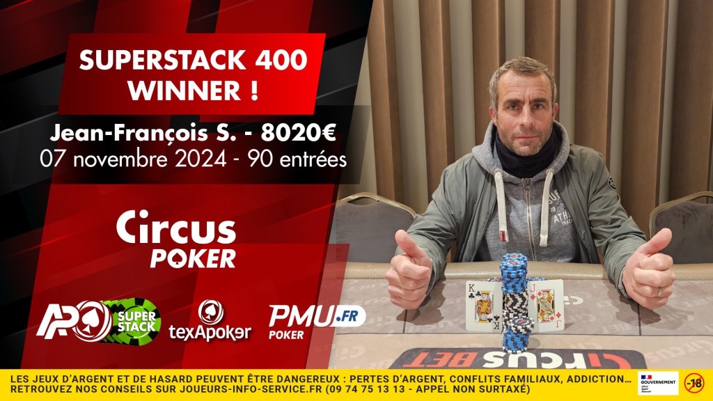Après plusieurs places payées et de nombreuses performances prometteuses, Jean-François Senet a finalement décroché sa première victoire sur le tournoi APO Circus SuperStack, empochant un gain de 8 020 €. Organisé au Club Circus, ce tournoi à 400€ de buy-in a rassemblé 90 participants, formant un prizepool total de 30.240€.