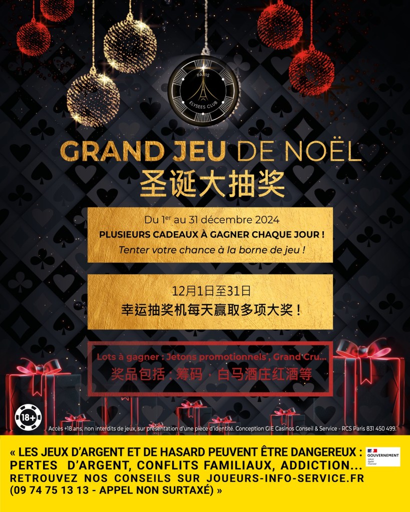 Durant tout le mois de décembre 2024, le Paris Élysées Club organise son Grand Jeu de Noël. Chaque jour, les joueurs et joueuses peuvent tenter leur chance et repartir avec de beaux cadeaux.