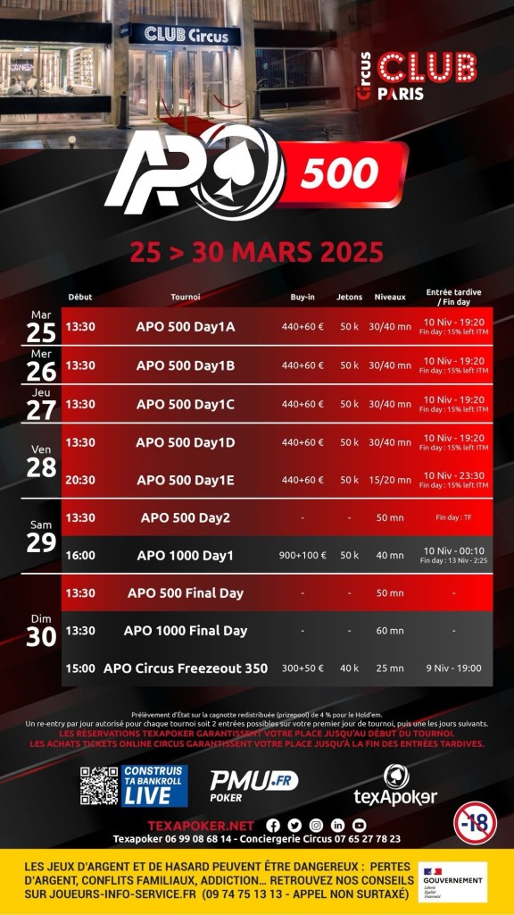 Le tournoi phare, l’APO 500, propose un buy-in de 500€ (440€ +60€) avec 50 000 jetons de départ et des niveaux évolutifs de 30 à 40 minutes. Cinq jours 1 sont programmés, avec une dernière chance en Day 1E turbo le vendredi soir. Les joueurs qualifiés se retrouveront le samedi 29 mars pour le Day 2, avant l’ultime bataille du Final Day le dimanche 30 mars.