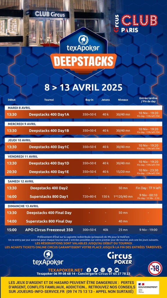 Le Club Circus Paris, situé dans le 16e arrondissement, s’apprête donc à vibrer au rythme de Texapoker. Ces tournois Deepstacks signés Texapoker devraient une fois de plus faire le plein.