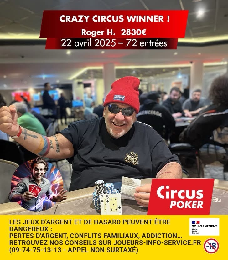 Le rideau est tombé sur une nouvelle édition du Crazy Circus au Club Circus, et c’est un vétéran au palmarès XXL qui s’est emparé du centre de la piste : Roger “Terminator” Hairabedian s’impose et empoche 2 830€, après une table finale bien animée.