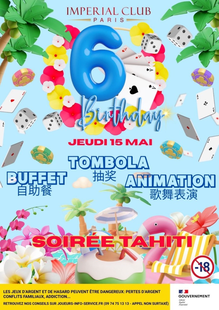Point d’orgue de cette semaine festive : la grande soirée d’anniversaire du jeudi 15 mai. L’Imperial Club Paris convie ses visiteurs à une Soirée Tahiti mêlant animations, spectacle de danse et buffet. Une immersion exotique dans un joli cadre, pour faire rimer jeu et évasion.