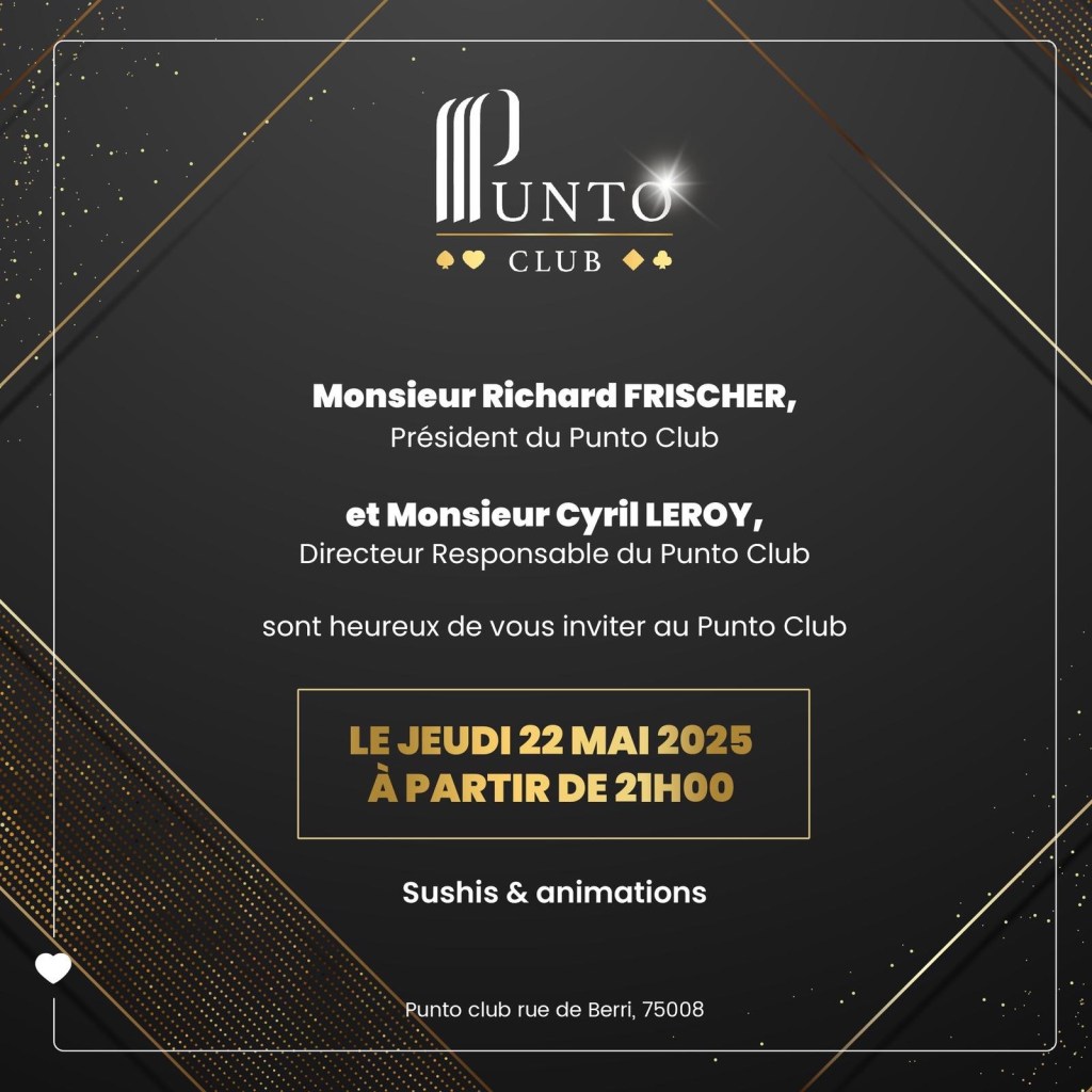 Situé au 11 rue de Berri, à deux pas de l’avenue des Champs-Élysées, le Punto Club ne se contente pas de proposer un cadre feutré et une sélection classique – Punto Banco, Blackjack, Ultimate Poker – il cultive un esprit. Celui d’un club où chaque jour a son tempo, et où le jeu se vit avec style et un brin d’audace. Une grande soirée est prévue le jeudi 22 mai avec Sushis et animations !