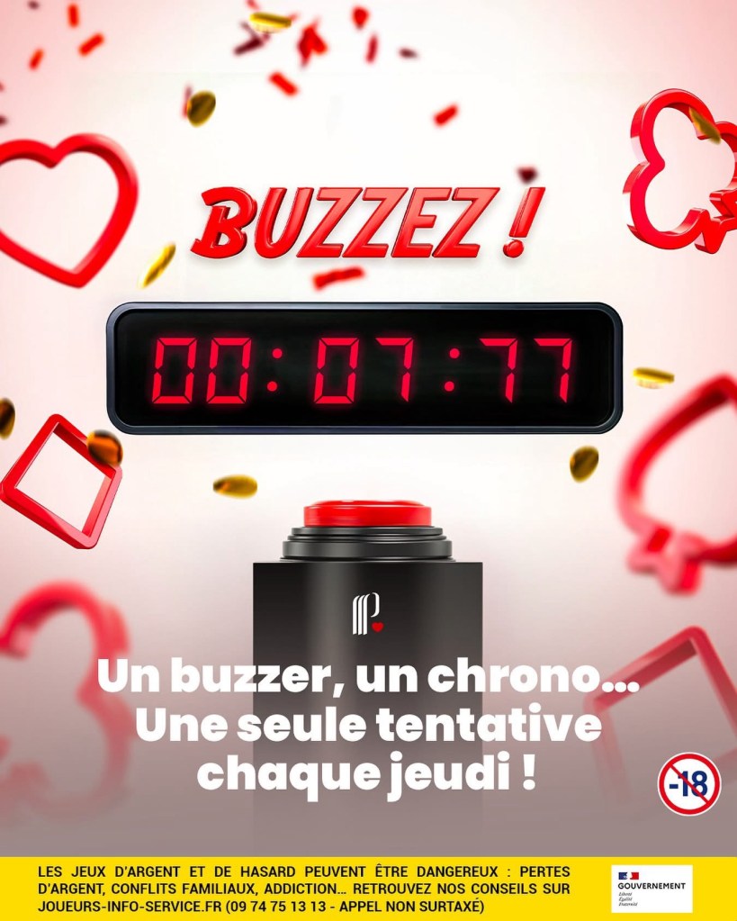 Et pour ceux qui aiment jouer avec leurs nerfs, rendez-vous le jeudi. Le Jeu du Buzzer, propose aux plus précis un petit frisson d’adrénaline. L’objectif ? Arrêter un chronomètre exactement sur 00:07:77. Une tâche en apparence anodine, mais qui demande sang-froid, précision et un bon timing. À la clé : 50 € de jetons non négociables.
