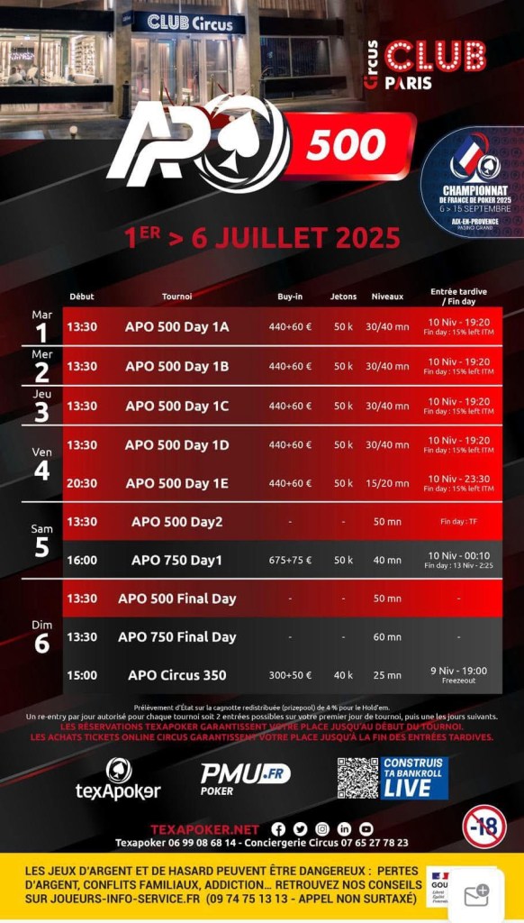 Du 1er au 6 juillet 2025, le Club Circus Paris accueille une nouvelle édition très attendue de l’APO 500, le tournoi phare du label Texapoker. En partenariat avec PMU Poker, ce rendez-vous s’impose une fois de plus comme l’un des temps forts du calendrier parisien.