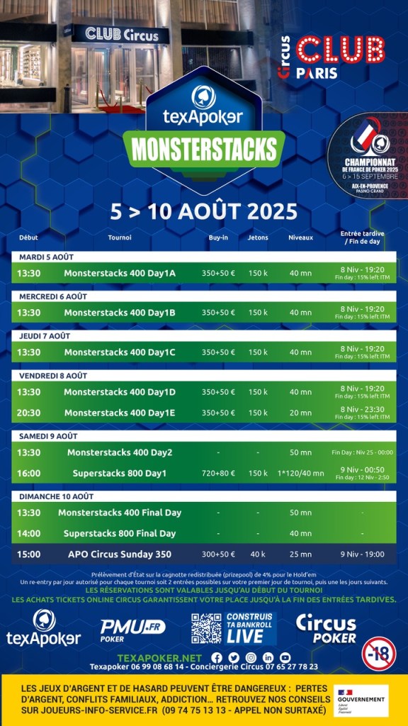 Les amateurs de deep run et de stacks bien dodus ont déjà coché la date : Texapoker revient au Club Circus Paris avec une édition estivale des Monsterstacks, du 5 au 10 août 2025. Dans la moiteur d’un été parisien, les jetons vont voler sous la clim’, et les grinders vont pouvoir s’en donner à cœur joie.
