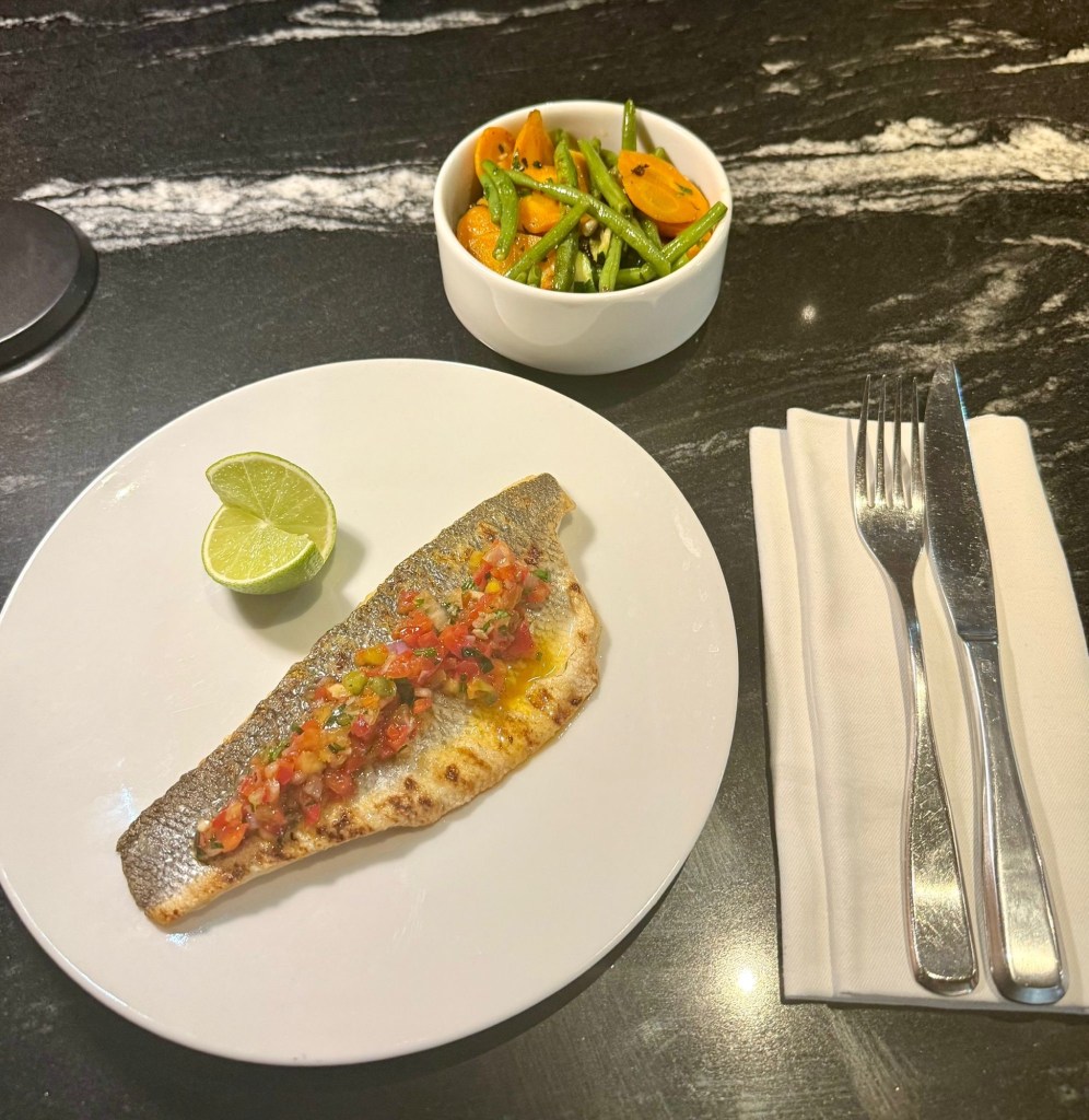 Lors d’un dîner, la dégustation démarre fort : burrata servie avec pastèque, pesto verde et menthe fraîche, fish & chips croustillant à souhait, saumon fumé aux notes délicatement iodées. En plat, un filet de bar aux accents ensoleillés, accompagné d’une vierge de légumes. Et pour clore le bal : trio sucré composé d’une tarte au citron meringuée, d’une salade de fruits de saison et d’une mousse au chocolat à la texture aérienne.