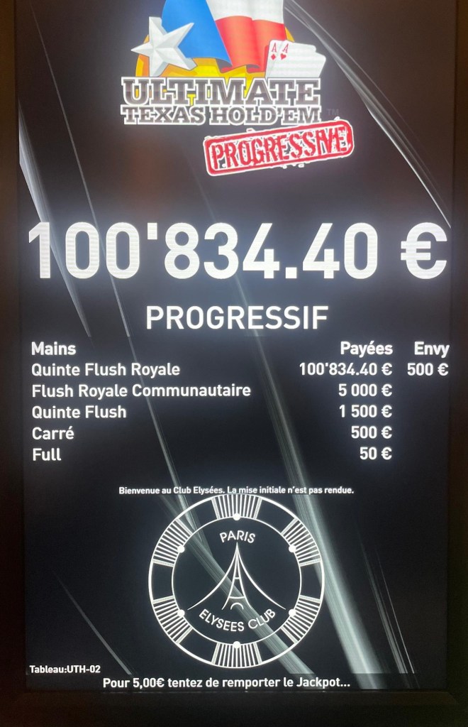 Ambiance électrique au Paris Elysées Club, où le jackpot progressif de l’Ultimate Texas Hold’em vient de franchir un nouveau cap symbolique : plus de 80.000€ à décrocher sur un seul coup de cartes !