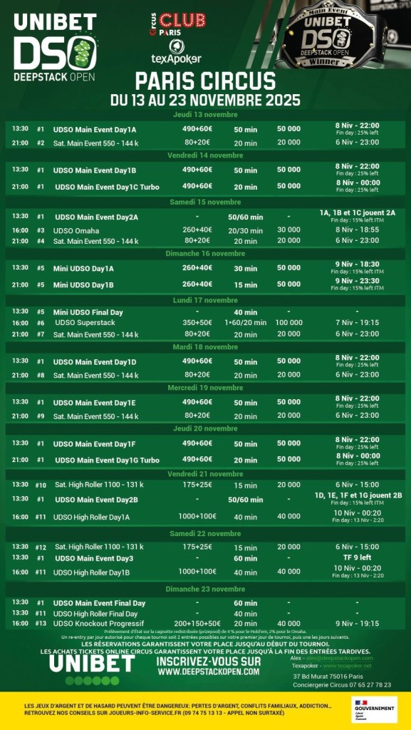 Le Club Circus, désormais bien installé dans le paysage parisien, s’apprête à vibrer au rythme du 13 au 23 novembre pour l’Unibet Deepstack Open, en partenariat avec TexaPoker. L’établissement de la porte de Saint-Cloud accueillera des centaines de joueurs venus de toute la France (et d’ailleurs) pour cette escale majeure du circuit.