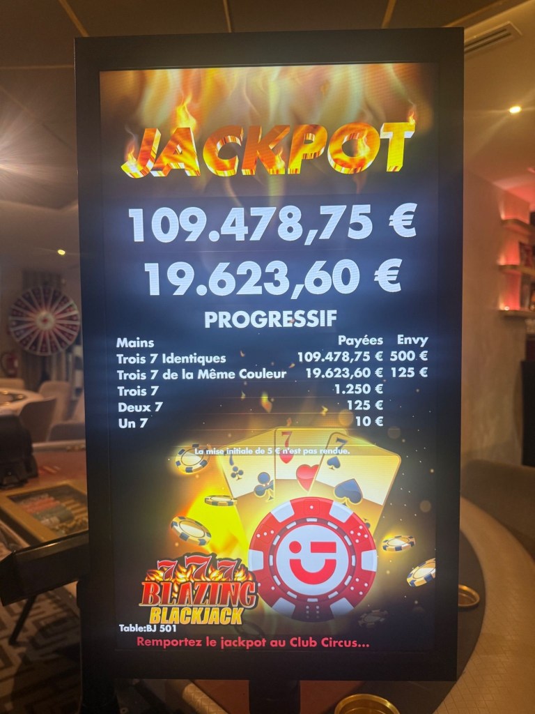 Au Club Circus Paris, les tables de Blackjack ont pris feu. Le jackpot progressif Blazing a franchi un nouveau cap, affichant 109 478,75 €, accompagné d’un Envy Bonus de 19 623,60 € pour les joueurs voisins. Une somme exceptionnelle, visible sur les écrans du club, qui attire tous les regards et électrise chaque donne.