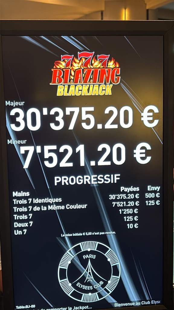 Le Paris Elysées Club a enregistré ce jeudi un nouveau gain sur l’une de ses tables de Blackjack, où un joueur a touché un triple 7 identique, déclenchant un paiement immédiat de 30 376 € via le side bet associé.