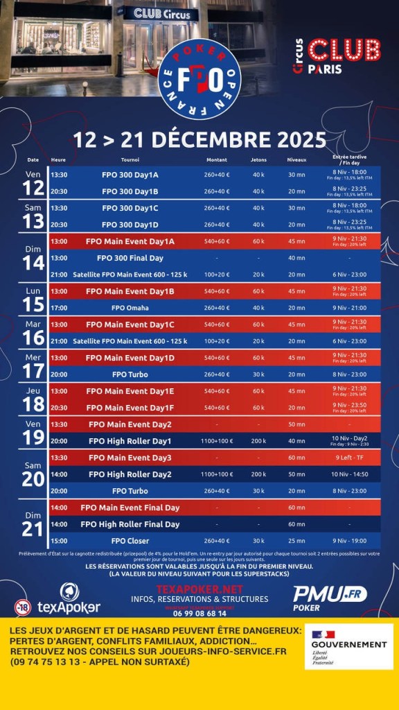 Programme complet du FPO Paris sur TexaPoker et aussi sur Circus Poker