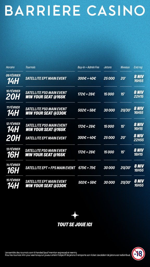 Les premières opportunités de qualification seront proposées les mercredis 28 janvier et 4 février à 20h, avec des satellites EPT Main Event à 340 € (300 € + 40 €). Ces tournois offriront 25 000 jetons de départ et des niveaux de 20 minutes.