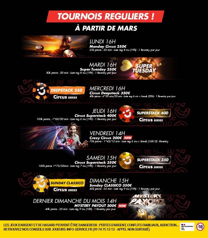 Le reste du mois conserve les grands classiques qui rythment la semaine au Circus Club. Le Monday Circus ouvre le bal chaque lundi à 16h avec un buy-in de 250 €, suivi le mardi par le Super Tuesday, également à 250 €. Le mercredi laisse place au Deepstack 350, un tournoi apprécié pour sa structure plus profonde.