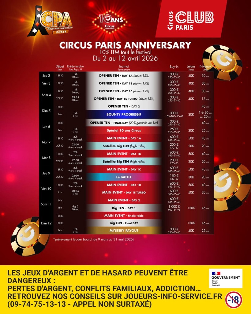 Avec ce Circus Paris Anniversary, le Club Circus Paris entend célébrer une décennie de développement tout en offrant aux joueurs un festival dense mais lisible. Entre tournois accessibles, Main Event structuré et événement à plus forte profondeur comme le Big Ten, la programmation couvre l’ensemble du spectre du poker live.