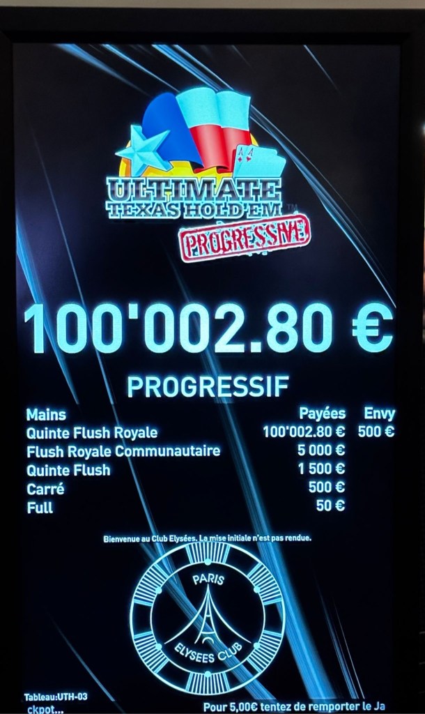 Le seuil symbolique est atteint. Le jackpot progressif de l’Ultimate Texas Hold’em du Paris Élysées Club vient de franchir la barre des 100.000 €. Un cap toujours très attendu dans l’univers des jeux de table, qui vient confirmer la montée en puissance de ce dispositif au sein du club parisien.