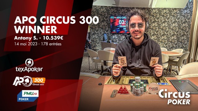 Dimanche dernier, l’APO Circus 300 organisé au Club Circus a, de nouveau, fait le plein avec 178 entrants (44.429€ de Prizepool). C’est Antony Saadoun qui s’est imposé pour 10.539€. En Heads-up, il a battu Elie […]