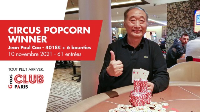 Le mercredi, le Club Circus Paris organise son tournoi Bounty, le PopCorn au buy-in de 330€. 61 entrants ont été enregistrés le 10 novembre. C’est Jean-Paul Cao qui l’emporte pour 4.018€ en plus de ses […]
